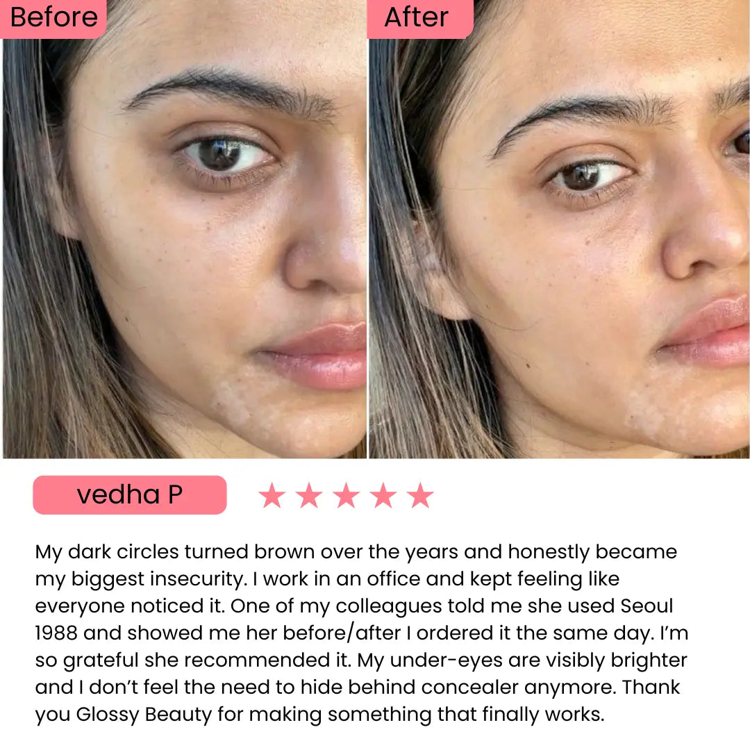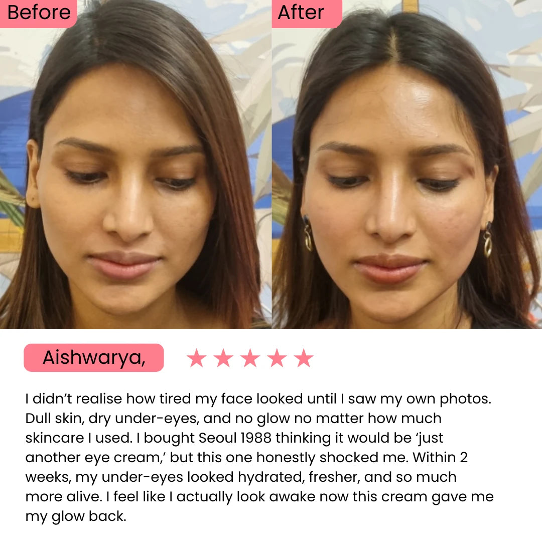 June 2025Ananya BVerified BuyerCorporate Girl With Laptop EyesI work 10–12 hours on my laptop every day and my under-eyes always looked purple and sunken. Nothing worked long-term. Two weeks with the Seoul 1988 Eye Cream and I actually stopped using concealer. The darkness faded so much, and the puffiness I had every morning literally disappeared. My office colleagues asked if I changed my sleep routine nope, just this cream!