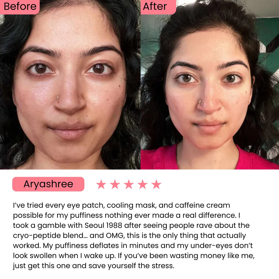 may 2025PriyaVerified BuyerStudent With Puffy Morning BagsI always woke up with swollen eyes no matter how much I slept. Within a week of using this, the puffiness reduced a lot and now I don’t look bloated or tired in the morning. My selfies look so much cleaner now my friends literally asked what filter I used. No filter, just Seoul 1988 😭🔥