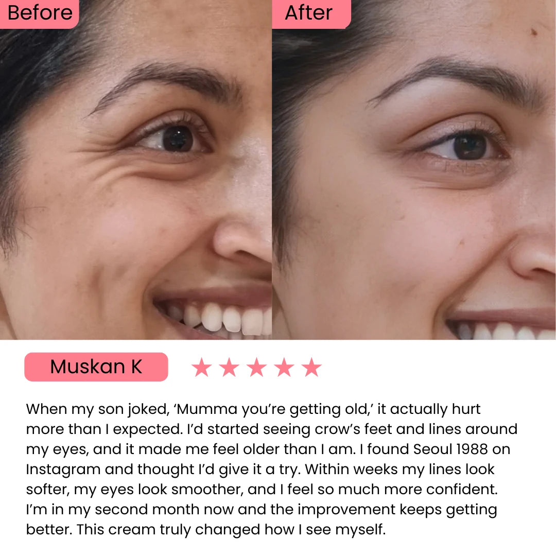 Jan 2025Sanika VVerified BuyerFine Lines & Crow’s Feet WarriorI tried every anti-aging eye cream out there but nothing touched the tiny lines around my eyes. Seoul 1988 was different the retinal liposome made my lines smoother and the area feels firmer. My makeup no longer settles into creases. If you’re over 35, don’t think twice. This one WORKS.